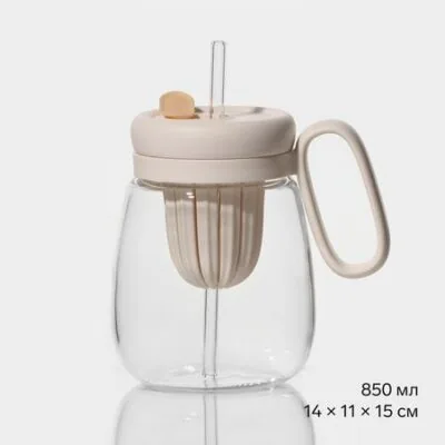 Кружка «Бьорн», 850 мл, с крышкой и трубочкой, стекло, бежевая