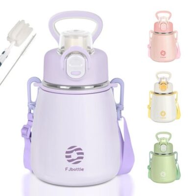 Кружка-бутылка FJbottle с вакуумной изоляцией для воды, легкая в использовании, из нержавеющей стали, в комплект входит чистящаяся фиолетовая бутылка, 600 мл, (с ремешком), Бутылка 2-х сторонняя, соломинка, фиолетовый