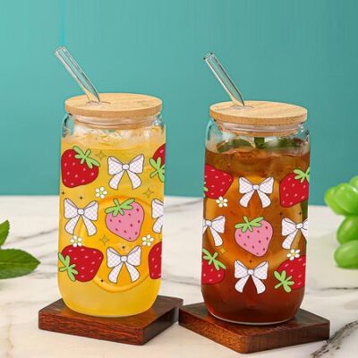 Кружка для питья 16 унций с принтом клубничного банта, бамбуковой крышкой и соломинкой, различные узоры, стакан для льда/кофе для рождественского подарка 401-500ml