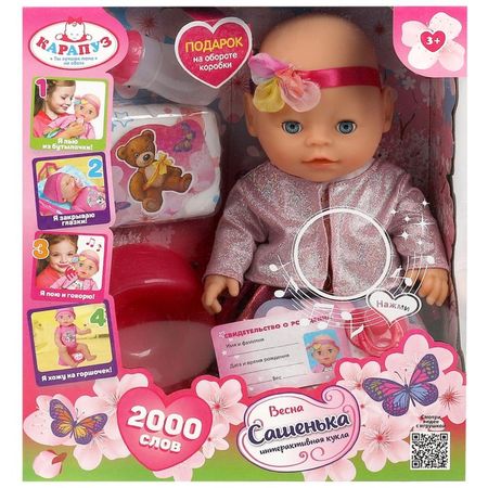 Главная » Все для дома Кукла — пупс интерактивный «Сашенька», 30 см, песни Шаинского, говорит 2000 слов, пьёт, писает, закрывает глаза, 4 аксессуара Просмотров 1 Кукла — пупс интерактивный «Сашенька», 30 см, песни Шаинского, говорит 2000 слов, пьёт, писает, закрывает глаза, 4 аксессуара Карапуз