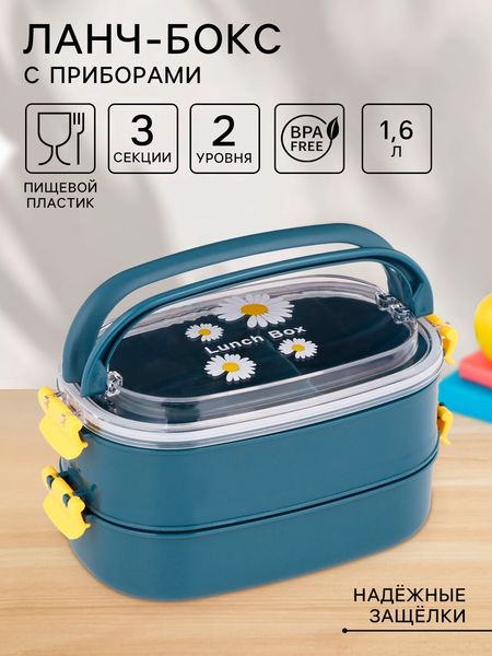 Ланч — бокс в школу, контейнер для еды, 1.6 л, с приборами, 2 уровня, 22.5×12.5×12 см, пластик, синий