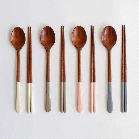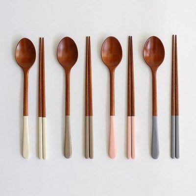 Ложка и палочки для еды Travel & Cook ручной работы из натурального лакированного дерева. Набор столовых приборов на 4 персоны, 4 ложки + 4 палочки для еды, 1 предмет, популярная корейская посуда.