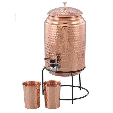 Медный диспенсер для воды объемом 5 литров с подставкой и 2 стаканами, не содержит БФА, нетоксичный, кованая текстура, не ржавеет и долговечный, с дополнительными полезными для здоровья свойствами меди