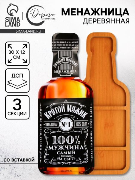 Менажница «Крутой мужик» — это не парадная похвала, а тёплая, чуть шутливая дань уважения человеку, на которого можно положиться. Её силуэт повторяет классическую бутылку виски — сдержанную, основательную, без вычурности. Три секции внутри — для закусок, орехов, сыра или фруктов — как намёк на разные роли одного и того же человека: отца, друга, напарника. А крышка, в стиле винтажной этикетки, несёт фразу: ”Крутой мужик. 100 % мужчина. Самый лучший на свете”. Без иронии. Без преувеличения. Просто — как есть.ОсобенностиФигурная форма в виде бутылки виски создаёт узнаваемый, но не навязчивый акцент на столе — подходит как для праздника, так и для вечернего чаепития.Три ячейки позволяют сочетать разные по вкусу и текстуре угощения, не нарушая целостности подачи.Крышка с рисунком плотно закрывает менажницу, сохраняя свежесть содержимого и усиливая визуальную законченность.Корпус из ДСП с имитацией натурального дерева — лёгкий, прочный, с приятной тактильной теплотой.Тематика раскрыта через искреннюю, почти разговорную формулировку — не лозунг, а фраза, которую легко сказать вслух за тостом.Ручная очистка (без посудомоечной машины) — небольшой ритуал заботы, напоминающий, что уважение проявляется и в мелочах.Как тост, который не нужно произносить вслухЭта менажница похожа на тот момент, когда он молча пододвигает тарелку поближе, проверяет, включён ли чайник, или просто сидит рядом — и этого достаточно. Надпись на крышке звучит громко, но не вызывающе: это не реклама, а признание. Как старая фотография в рамке — не идеальная, но настоящая.Подарите её отцу, брату, другу — тому, кто не ждёт благодарности, но заслуживает, чтобы его увидели. Или поставьте на свой стол — как напоминание: быть ”крутим мужиком” — не значит быть безупречным. Это значит быть надёжным. Быть рядом. Быть собой — ”100 % мужчина”, без добавок и вычетов.
