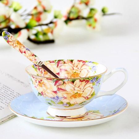 Модные голубые цветы, кофейная чашка и блюдце из костяного фарфора с ложкой, роскошный и изысканный керамический чайный сервиз в европейском стиле синий