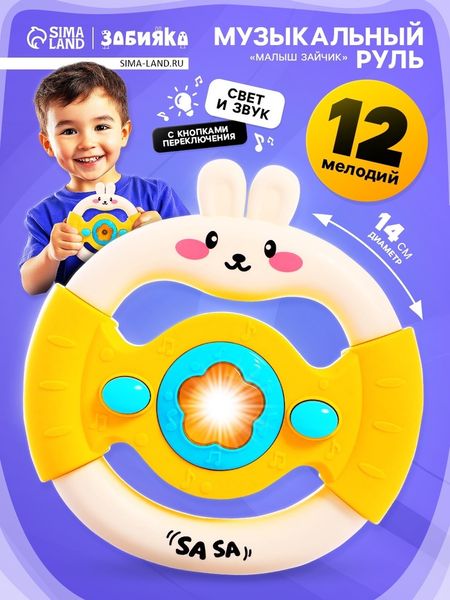 Музыкальный руль «Малыш зайчик» — это яркая и увлекательная игрушка для малышей от 12 месяцев. Она станет отличным спутником в играх и поможет развить координацию, слуховое и зрительное восприятие. Жёлтый цвет и световые эффекты привлекают внимание, а звуковые функции делают игру ещё интереснее.Особенности12 мелодий для развлечения и обучения.Световые эффекты создают атмосферу веселья.Кнопки переключения мелодий удобны для маленьких ручек.Для работы нужны 2 батарейки типа АА (в комплект не входят).Играем с пользойМузыкальный руль помогает развивать мелкую моторику, слуховое восприятие и координацию движений. Яркие огоньки и звуки стимулируют интерес малыша, а удобная форма руля делает игру комфортной. Это идеальный подарок для маленьких исследователей, которые только начинают познавать мир.