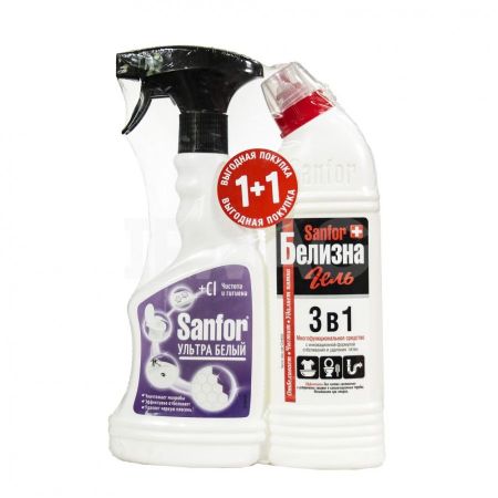 Активная формула спрея Sanfor эффективно устраняет микробов, плесень и пятна различного происхождения, отлично отбеливает поверхности. Удаляет жир, подтёки и грязь. Легко и быстро очистит раковину, ванну и душевую кабину, унитаз, керамическую плитку, настенные панели, моющиеся обои, бытовую технику. Подходит для уборки туалетов для животных. Обладает антимикробными свойствами. Оставляет после уборки аромат чистоты и свежести.Гель отбеливающий Sanfor Белизна комплексного действия — специальное густое средство с инновационной формулой отбеливания и удаления пятен. Благодаря комплексному действию незаменимо при стирке, а также для дезинфекции и чистки сантехники и труб. Многофункциональное средство отбеливает, дезинфицирует, чистит: ванны, раковины, унитазы, канализационные стоки, пол, кафель, пластик, посуда (кроме металлической). Загущенная консистенция хорошо удерживает гель на вертикальных поверхностях.