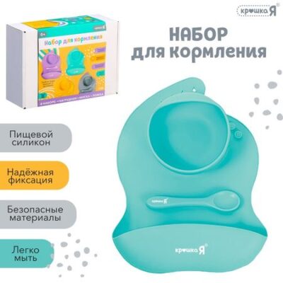 Набор для кормления торговой марки «Крошка Я» поможет приучить малыша к самостоятельному приёму пищи. Детская силиконовая посуда идеально подходит для первого прикорма, и имеет специально разработанную для малышей форму.Основные преимущества набора:Вся посуда изготовлена из безопасного и гипоаллергенного материала – пищевого силикона. Изделия не впитывают запахи и не окрашиваются. Можно мыть в посудомоечной машине.Надёжная присоска позволяет хорошо зафиксировать тарелку на любой гладкой поверхности, предотвращая возможность её переворачивания. Тарелочка может быть использована для разогрева пищи в микроволновой печи, а также замораживания детского питания в морозильнике.Нагрудник мягкий на ощупь, имеет закруглённые края: не поцарапает и не натрёт нежную кожу ребёнка. Фиксируется за шеей с помощью застёжки, можно регулировать уровень положения нагрудника в зависимости от роста малыша. Наличие кармашка не даст еде упасть на стол или на пол, а также убережёт одежду малыша от загрязнений и пятен.Удобная силиконовая ложка отлично подходит для маленьких ручек. С ней ребёнок быстрее научится самостоятельному кормлению, а также пользоваться столовыми приборами.Набор для кормления подходит малышам от 0 месяцев.