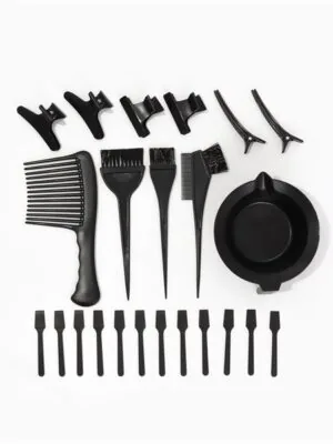 Набор содержит все требуемые инструменты для качественного окрашивания волос. В него входит: чаша для смешивания краски, 6 зажимов для волос, 3 кисточки, гребень, лопатка. Предметы выполнены из прочного пластика, который не впитывает краску, легко моется и долго служит.