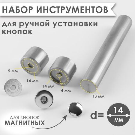 Набор инструментов из стали для ручной установки магнитных кнопок диаметром 14 мм предназначен для быстрого и надежного крепления металлических застежек на различных тканях и материалах. Этот комплект обеспечивает точность и безопасность при работе с крупными магнитными кнопками, делая процесс установки простым и удобным.ОсобенностиВ комплект входит набор стальных инструментов, специально разработанных для монтажа магнитных застежек диаметром 14 мм.Обеспечивает надежное закрепление металлических кнопок на одежде, сумках и аксессуарах.Изготовлено из прочной стали, которая гарантирует долговечность и устойчивость к износу.Позволяет точно и аккуратно устанавливать крупные магнитные кнопки без повреждения ткани или материала.Идеально подходит для швей, рукодельниц и мастерских по ремонту одежды или изготовлению аксессуаров.Практическое применениеЭтот набор помогает быстро закрепить магнитные застежки диаметром 14 мм, обеспечивая прочное соединение. Стальные инструменты позволяют захватывать металлические элементы с высокой точностью, что делает работу комфортной и безопасной. Компактный дизайн делает его удобным для хранения и транспортировки, а универсальность — незаменимым помощником в создании или ремонте одежды, сумок и других изделий. Надежное крепление магнитных кнопок повышает функциональность изделий и способствует их долговечности.