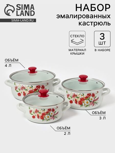 Набор эмалированных кастрюль — это базовый комплект для повседневной готовки, сочетающий проверенную надежность эмалированной стали и практичность стеклянных крышек. Белый фон с цветочным узором добавляет на кухню уют.Особенности:Три объёма: в наборе три кастрюли разного размера, достаточных для варки супа, приготовления гарнира или компота. Не нужно подбирать посуду по отдельности — всё необходимое уже собрано.Стеклянные крышки: прозрачные крышки из стекла позволяют следить за процессом готовки без открывания. Пар остаётся внутри, а вы видите, когда блюдо готово.Качественный материал: покрытие не вступает в реакцию с продуктами, не окрашивается и не впитывает запахи. Мыть нужно вручную — но гладкая поверхность не держит жир и отмывается за минуты.Набор не требует особых условий эксплуатации, не боится кипячения. Ручки не снимаются — они надёжно закреплены и выдерживают вес наполненной кастрюли.