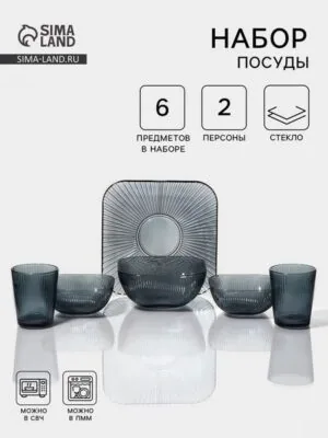 Набор посуды «Мави», 6 предметов: 2 миски 350 мл, 2 стакана 250 мл, салатник 800 мл, тарелка d=20.8 см, стекло, серый