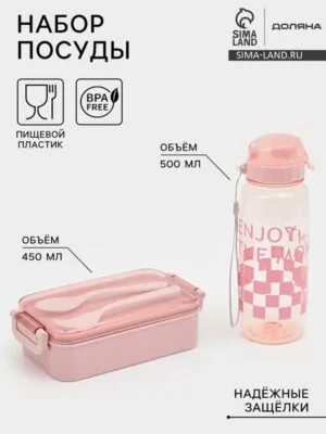 Главная » Все для дома Набор посуды с собой Доляна, 4 предмета: бутылка 500 мл, ланч-бокс 20×17×5.5 см, вилка, ложка, пластик, розовый Просмотров 3 Набор посуды с собой Доляна, 4 предмета: бутылка 500 мл, ланч-бокс 20×17×5.5 см, вилка, ложка, пластик, розовый Доляна