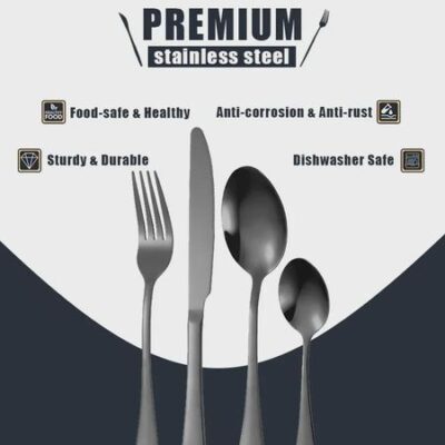 «Набор столовых приборов из нержавеющей стали с титановым покрытием, 24 предмета»: Нож, вилка и ложка в коробке с откидной крышкой.