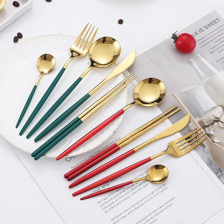 Набор столовых приборов из нержавеющей стали в португальском стиле: Ложка, нож, вилка, чайная ложка для использования в отеле, ресторане или дома. Teaspoon зелёный/золотой
