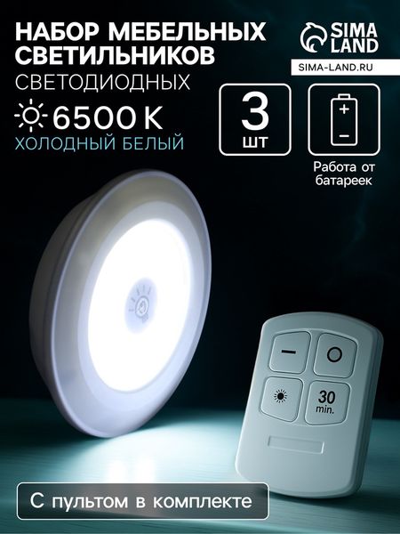 Набор светильников светодиодных, 3 штуки, нажимной, 6500К, от батареек, пульт в комплекте