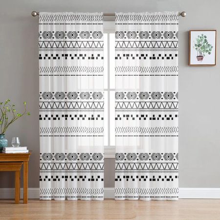 Нарисованные от руки линии, ромбовидная геометрия, прозрачные прозрачные шторы для спальни, праздничное украшение, оконная вуаль, тюлевая занавеска 135W x 114H(cm)