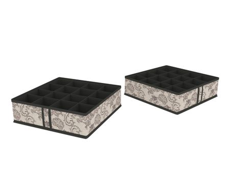Органайзер размером 35х35х10 см., позволит организовать рациональное хранение нижнего белья, носков, чулок и других подобных вещей. Он разбит на 16 ячеек, каждая из которых предназначена для одной пары, каркас изделия выполнен из картона. Практичная и компактная модель поместится в выдвижной ящик или шкаф. Благодаря качественной застежки-молнии на донышке — органайзер легко складывается и раскладывается. Изделие изготовлено из нетканого, "дышащего" материала.