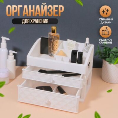 Органайзер для хранения, 8 секций, 2 ящика, 25×16.5×20 см, белый. Органайзер соберет все ваши косметические принадлежности в одном месте и поможет навести порядок. В основном отсеке расположите баночки, тюбики, спонжи и другие средства или предметы. Выдвижные ящики позволяют хранить различный декор, косметику, небольшие аксессуары, ватные палочки и все, что вам необходимо для ухода за собой. Органайзер станет гармоничным дополнением любого интерьера.