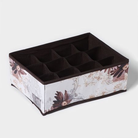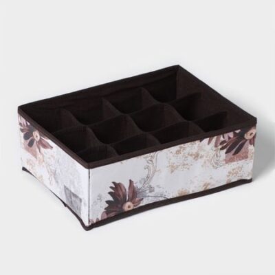 Органайзер для хранения белья Доляна «Астра», 12 ячеек, 32×24×12 см, коричневый. Представляем идеальное решение для наведения порядка в Вашем гардеробе — органайзер для хранения белья. Органайзер с 12 отделениями станет полезным в каждом доме и позволит организовать идеальную систему хранения вещей. <b> Применение:</b> <ul> <li> Этот кофр для хранения вещей сделает ваш гардероб более удобным и компактным, а Вам при этом не придется искать нужную вещь среди кучи белья и аксессуаров.</li> <li> Органайзер подойдет для хранения разных вещей: нижнего белья, носков, колготок, бюстгальтеров, ремней, галстуков и даже мелких аксессуаров.</li> <li> Органайзер выполнен из качественных материалов и имеет ячейки, чтобы вы могли организовать хранение вещей удобным способом.</li> <li> Прямоугольный короб с легкостью поместятся на полке в многоярусном шкафу, секционном шкафчике и даже прикроватной тумбочке.</li> </ul>