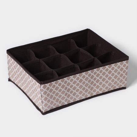 Органайзер для хранения белья Доляна «Браун», 12 ячеек, 32×24×12 см, коричневый. Представляем идеальное решение для наведения порядка в Вашем гардеробе — органайзер для хранения белья. Органайзер с 12 отделениями станет полезным в каждом доме и позволит организовать идеальную систему хранения вещей. <b> Применение:</b> <ul> <li> Этот кофр для хранения вещей сделает ваш гардероб более удобным и компактным, а Вам при этом не придется искать нужную вещь среди кучи белья и аксессуаров.</li> <li> Органайзер подойдет для хранения разных вещей: нижнего белья, носков, колготок, бюстгальтеров, ремней, галстуков и даже мелких аксессуаров.</li> <li> Органайзер выполнен из качественных материалов и имеет ячейки, чтобы вы могли организовать хранение вещей удобным способом.</li> <li> Прямоугольный короб с легкостью поместятся на полке в многоярусном шкафу, секционном шкафчике и даже прикроватной тумбочке.</li> </ul>