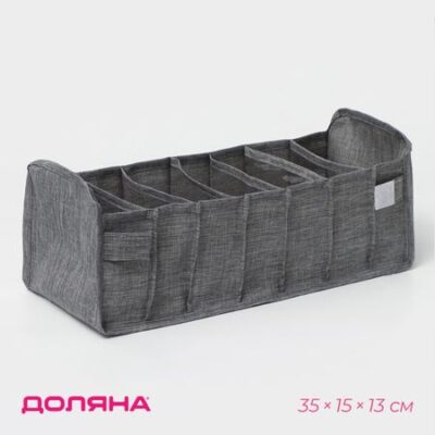 Органайзер для хранения белья Доляна, 7 ячеек, 35×15×13 см, серый. Многие сталкиваются с проблемой размещения небольших вещей. Занимать ими целую полку жалко, а хранить в других местах неэстетично. Решение есть! Органайзер поможет разобраться с беспорядком. Поставьте его в гардероб или на пол, и вы всегда будете знать, где и что в нем находится. Благодаря легкости убрать изделие на возвышение смогут даже хрупкие девушки. <b> Преимущества товара:</b> <ul> <li> Большой объем.</li> <li> Многофункциональность.</li> <li> Малый вес и отсутствие острых углов.</li> <li> Стильный дизайн.</li> <li> Вместе с этим простым предметом в доме поселятся порядок и уют. Оригинальное изделие дополнит ваш интерьер и станет украшением помещения.</li> </ul>