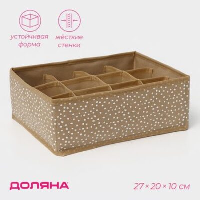Органайзер для хранения белья Доляна Points, 12 ячеек, 27×20×10 см, бежевый. Представляем идеальное решение для наведения порядка в Вашем гардеробе — органайзер для хранения белья. Органайзер с 12 отделениями станет полезным в каждом доме и позволит организовать идеальную систему хранения вещей. <b> Применение:</b> <ul> <li> Этот кофр для хранения вещей сделает ваш гардероб более удобным и компактным, а Вам при этом не придется искать нужную вещь среди кучи белья и аксессуаров.</li> <li> Органайзер подойдет для хранения разных вещей: нижнего белья, носков, колготок, бюстгальтеров, ремней, галстуков и даже мелких аксессуаров.</li> <li> Органайзер выполнен из качественных материалов и имеет ячейки, чтобы вы могли организовать хранение вещей удобным способом.</li> <li> Прямоугольный короб с легкостью поместятся на полке в многоярусном шкафу, секционном шкафчике и даже прикроватной тумбочке.</li> </ul>