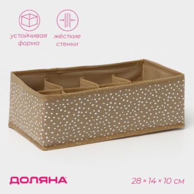 Органайзер для хранения белья Доляна Points, 8 ячеек, 28×14×10 см, бежевый. Многие сталкиваются с проблемой размещения небольших вещей. Занимать ими целую полку жалко, а хранить в других местах неэстетично. Решение есть! Органайзер поможет разобраться с беспорядком. Поставьте его в гардероб или на пол, и вы всегда будете знать, где и что в нем находится. Благодаря легкости убрать изделие на возвышение смогут даже хрупкие девушки. <b> Преимущества товара:</b> <ul> <li> Большой объем.</li> <li> Многофункциональность.</li> <li> Малый вес и отсутствие острых углов.</li> <li> Стильный дизайн.</li> <li> Вместе с этим простым предметом в доме поселятся порядок и уют. Оригинальное изделие дополнит ваш интерьер и станет украшением помещения.</li> </ul>
