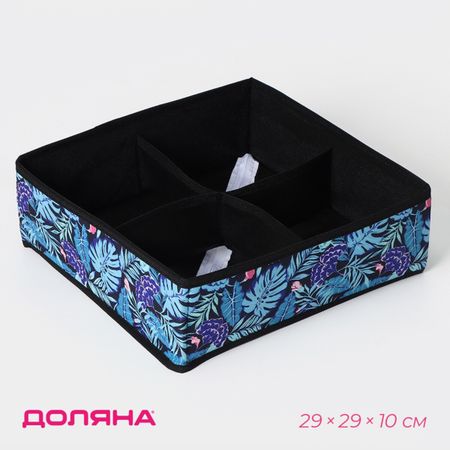 Органайзер для хранения белья Доляна «Тропики», 4 ячейки, 29×29×10 см, синий. Представляем идеальное решение для наведения порядка в вашем гардеробе — органайзер для хранения белья с 4 ячейками сделает ваш гардероб более удобным и компактным, а Вам при этом не придется искать нужную вещь среди кучи белья и аксессуаров. Организуйте идеальную систему хранения вещей с органайзерами для белья. <b> Применение:</b> <ul> <li> Органайзер подойдет для хранения разных вещей: нижнего белья, носков, колготок, бюстгальтеров, ремней, галстуков и даже мелких аксессуаров.</li> <li> Органайзер выполнен из качественных материалов и имеет ячейки, чтобы вы могли организовать хранение вещей удобным способом.</li> <li> Прямоугольный короб с легкостью поместятся на полке в многоярусном шкафу, секционном шкафчике и даже прикроватной тумбочке.</li> </ul>