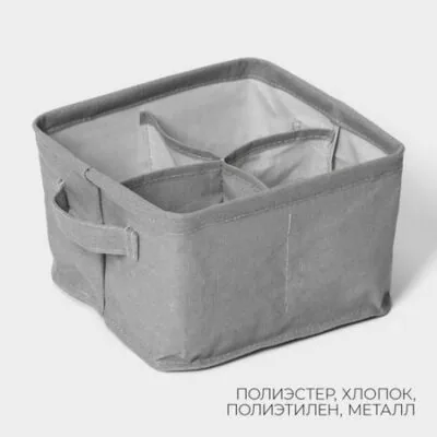 Органайзер для хранения белья LaDо́m, 4 ячейки, 20.5×20.5×12 см, серый. Представляем идеальное решение для наведения порядка в вашем гардеробе — органайзер для хранения белья с 4 ячейками сделает ваш гардероб более удобным и компактным, а Вам при этом не придется искать нужную вещь среди кучи белья и аксессуаров. Организуйте идеальную систему хранения вещей с органайзерами для белья. <b> Применение:</b> <ul> <li> Органайзер подойдет для хранения разных вещей: нижнего белья, носков, колготок, бюстгальтеров, ремней, галстуков и даже мелких аксессуаров.</li> <li> Органайзер выполнен из качественных материалов и имеет ячейки, чтобы вы могли организовать хранение вещей удобным способом.</li> <li> Прямоугольный короб с легкостью поместятся на полке в многоярусном шкафу, секционном шкафчике и даже прикроватной тумбочке.</li> </ul>