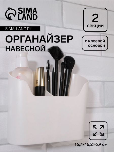 Органайзер настенный, 2 секции, с клеевой основой, 16.7×6.9 см, белый. Создайте уют и порядок в своем доме с навесным органайзером «Нежность». Этот стильный аксессуар с двумя секциями идеально подойдет для хранения косметики, мелких гигиенических принадлежностей или любых других нужных вещей. Его компактные размеры — 16,7 x 6,9 см — позволят разместить его даже в самых ограниченных пространствах, будь то ванная комната, кухня или спальня. Органайзер изготовлен из высококачественного пластика, обеспечивая его долговечность и устойчивость к влаге. Белый цвет добавит свежести и гармонии в ваш интерьер, подходя к любому стилю. Благодаря клеевой основе, он легко крепится на стену, не требуя сверления или дополнительных инструментов, и помогает экономить место в шкафах и на полках. <ul> <li> <strong> Эргономичный дизайн:</strong> две секции позволяют удобно организовать хранение самых разнообразных мелочей.</li> <li> <strong> Легкость монтажа:</strong> клеевая основа обеспечивает простое и надежное крепление без повреждения стен.</li> <li> <strong> Универсальность:</strong> подходит для хранения косметики, аксессуаров и других мелких предметов в ванной, спальне или на кухне.</li> <li> <strong> Компактность и стиль:</strong> современный дизайн и нейтральный белый цвет легко вписываются в любой интерьер.</li> <li> <strong> Прочность и долговечность:</strong> выполнен из качественного пластика, который не боится влаги и износа.</li> </ul> Органайзер «Нежность» — это отличное решение для тех, кто ценит порядок и красоту в каждом уголке своего дома. Удобное и стильное хранение теперь доступно каждому!