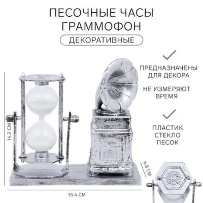 Песочные часы «Граммофон» – винтажная деталь в вашем доме!Эти изысканные песочные часы в форме граммофона перенесут вас в эпоху старинной музыки и романтики. Размеры сувенира – 15.4 х 6.8 х 14.2 см – делают его идеальным дополнением к любому интерьеру, будь то домашняя библиотека, рабочий кабинет или гостиная.Особенности:Винтажный дизайн: Граммофон всегда привлекает внимание и вызывает интерес, становясь центром притяжения взглядов. Форма граммофона добавляет нотку ретро-стиля, превращая часы в уникальный элемент декора.Высокое качество: Изготовлены из прочных материалов, гарантирующих долговечность и надежность изделия.Отличный подарок: Идеальный вариант подарка для любителей антиквариата, музыкантов и всех, кто ценит оригинальные вещи.Универсальность: Подойдут для любых помещений, от современных офисов до классических домашних библиотек.Подарите себе или близким частичку прошлого с песочными часами «Граммофон»!