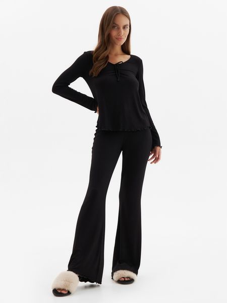 Выбирайте настоящий уют и безупречный комфорт с восхитительной женской пижамой от бренда MINAKU. Этот комплект выполнен в стиле минимализма и доступен в размере 48, предлагая роскошь высокого качества и натурального материала — идеальной для женского тела.Основные преимущества:Натуральность: вискозная ткань обладает удивительными свойствами — мягкая, дышащая и приятная к коже, создает приятное ощущение свежести и расслабленности.Красивый силуэт: расширяющиеся книзу брюки создают визуально тонкий силуэт, скрывая недостатки и подчеркивая достоинства женской фигуры.Изящные аксессуары: заканчивающие комплект тонкие завязки помогают создать индивидуальный и удобный силуэт, дополняя общий стиль аксессуарами.Многофункциональность: прекрасно подходит для отдыха дома, путешествий или ночлега вне города, выдерживая любые погодные условия и обеспечивая комфорт круглый год.Советы по уходуЧтобы обеспечить долгую службу вашему новому приобретению, следуйте простым правилам ухода: деликатная стирка при низкой температуре (до 30°C), мягкий режим глажки и исключение агрессивных моющих средств. Это позволит изделию сохранять прекрасный внешний вид долгие месяцы и радовать вас своим качеством ежедневно.Этот универсальный и беспроигрышный чёрный тон дарит владельцу незабываемый шарм и благородство. Он способен скрыть возможные пятна и придать образу больше солидности и гармонии. Оптимален для тех, кто предпочитает спокойные тона и любит классику, подходящую каждому случаю.