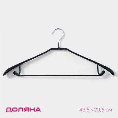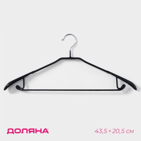 Плечики — вешалка для одежды Доляна, 43.5×20.5 см, широкие плечики, антискользящее покрытие, черные. На неудачно сложенной одежде могут появиться заломы и складки, из-за чего вещи приходится гладить повторно. Это маленькое неудобство можно решить с помощью специального предмета. Вешалка – это компактное приспособление, которое позволит вам разместить в гардеробе классические штаны из легких или плотных материалов, блузки, рубашки, кофты и другие вещи. Изделие практичной формы занимает мало места, что позволяет экономить пространство в шкафу. Эргономичная форма поможет надежно зафиксировать одежду и предотвратить ее падение. Преимущества: <ul> <li> небольшой размер;</li> <li> долговечность;</li> <li> удобство эксплуатации;</li> <li> безопасное покрытие.</li> </ul>