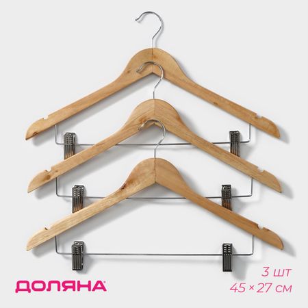 Плечики — вешалки для брюк и юбок Доляна, 45×27 см, 3 шт., с зажимами, сорт С, широкие плечики, дерево. На неудачно сложенной одежде могут появиться заломы и складки, из-за чего вещи приходится гладить повторно. Это маленькое неудобство можно решить с помощью специального предмета. Вешалка – это компактное приспособление, которое позволит вам разместить в гардеробе классические штаны из легких или плотных материалов, блузки, рубашки, кофты и другие вещи. Изделие практичной формы занимает мало места, что позволяет экономить пространство в шкафу. Противоскользящее покрытие надежно зафиксирует одежду и предотвратит ее падение. Преимущества: <ul> <li> долговечность;</li> <li> удобство эксплуатации;</li> <li> безопасное покрытие.</li> </ul>