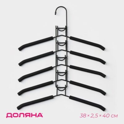 Плечики — вешалки для одежды Доляна, 38×40 см, многоуровневая, съемные вешалки, антискользящее покрытие, черные. На неудачно сложенной одежде могут появиться заломы и складки, из-за чего вещи приходится гладить повторно. Это маленькое неудобство можно решить с помощью специального предмета. Вешалка – это компактное приспособление, которое позволит вам разместить в гардеробе классические штаны из легких или плотных материалов, блузки, рубашки, кофты и другие вещи. Изделие практичной формы занимает мало места, что позволяет экономить пространство в шкафу. Эргономичная форма поможет надежно зафиксировать одежду и предотвратить ее падение. Преимущества: <ul> <li> небольшой размер;</li> <li> долговечность;</li> <li> удобство эксплуатации;</li> <li> безопасное покрытие.</li> </ul>