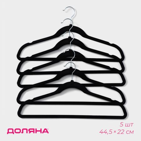 Плечики — вешалки для одежды Доляна, 44.5×22 см, 5 шт., флокированное покрытие, черные. На неудачно сложенной одежде могут появиться заломы и складки, из-за чего вещи приходится гладить повторно. Это маленькое неудобство можно решить с помощью специального предмета — вешалки. Вешалка – это компактное приспособление, которое позволит вам разместить в гардеробе классические штаны из легких или плотных материалов, блузки, рубашки, кофты и другие вещи. Изделие практичной формы занимает мало места, что позволяет экономить пространство в шкафу. Эргономичная форма поможет надежно зафиксировать одежду и предотвратить ее падение. Преимущества: <ul> <li> Небольшой размер;</li> <li> Долговечность;</li> <li> Удобство эксплуатации;</li> <li> Нескользящее покрытие.</li> </ul>