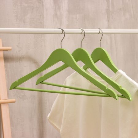 Плечики — вешалки для одежды LaDо́m Brillant, 44.5×23×1.2 см, 3 шт., дерево, фисташковые. На неудачно сложенной одежде могут появиться заломы и складки, из-за чего вещи приходится гладить повторно. Это маленькое неудобство можно решить с помощью специального предмета — вешалка. Вешалка – это компактное приспособление, которое позволит вам разместить в гардеробе классические штаны из легких или плотных материалов, блузки, рубашки, кофты и другие вещи. Изделие практичной формы занимает мало места, что позволяет экономить пространство в шкафу. Эргономичная форма поможет надежно зафиксировать одежду и предотвратить ее падение. Преимущества: <ul> <li> Небольшой размер;</li> <li> Долговечность;</li> <li> Удобство эксплуатации;</li> <li> Безопасное покрытие.</li> </ul>