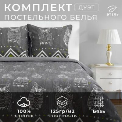 Постельное белье "Этель" дуэт Ушастые совы (вид 1) 143 х 215 см — 2 шт., 220 х 240 см, 70 х 70 см — 2 шт. Постельное белье «Этель: бязь» освежит интерьер любой спальни, внесет в него новые краски и создаст в комнате неповторимый комфорт и атмосферу уюта. <b> Чем хороша бязь?</b> Комплекты из этой ткани — выбор практичных людей. Данный материал обладает массой положительных качеств. Он: <ul> <li> приятный на ощупь;</li> <li> подходит даже для людей с чувствительной кожей;</li> <li> отлично пропускает воздух и впитывает влагу, поддерживая комфортный микроклимат в постели на протяжении всей ночи;</li> <li> неприхотлив в уходе;</li> <li> не дает усадки после стирки.</li> </ul> <b> Особенности постельного белья</b> <ul> <li> Постельное белье соответствует стандартам ГОСТ 31307-2005 и имеет европейский сертификат качества Oeko-Tex.09.HRU.73228.</li> <li> Изделия изготовлены из 100 % натурального экологически чистого хлопка.</li> <li> Плотность ткани составляет 125 г/м².</li> <li> Для нанесения рисунков использовались качественные европейские красители. Именно поэтому цвета надолго останутся яркими и насыщенными, а аллергия и раздражения пройдут мимо.</li> <li> Простыня без поперечного шва!</li> <li> Все внутренние швы дополнительно обработаны оверлоком, чтобы избежать естественного осыпания края.</li> <li> Вход в пододеяльник и наволочки оформлен клапаном, простыня без резинки.</li> </ul> <b> Комплектация:</b> Пододеяльник, 143 × 215 см — 2 шт.;<br> простыня 220 × 240 см — 1 шт.;<br> наволочка, 70 × 70 см — 2 шт. <b> Рекомендации по уходу за изделиями</b> : стирка при температуре не выше 40 °C без использования отбеливающих средств.