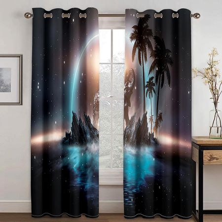 Причудливый пейзаж с рисунком животных 3D цифровая печать занавеска фантазийная сцена уединение слабое затемнение занавеска ткань две части W50xH130(CM)x2pcsGrommet Top темно-синий