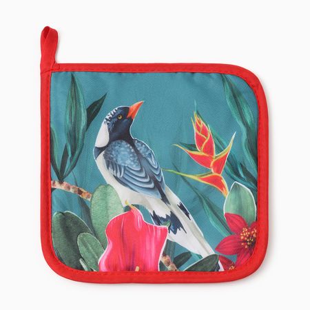 Эта квадратная кухонная прихватка станет вашим незаменимым помощником и ярким акцентом на кухне. Практичный размер 17 на 17 сантиметров удобно ложится в ладонь, надёжно защищая её от жара сковородок и горячих противней. Яркий зелёный фон с детализированным рисунком птиц создаёт ощущение уюта и гармонии, напоминая о летнем саде даже в будничный день.ОсобенностиИдеальный размер для безопасного захвата ручек кастрюль и сковородок.Изготовлена из 100% гладкого полиэстера — материал плотный, долговечный и приятный на ощупь.Чёткий, стойкий рисунок не выцветает со временем.Простая в уходе: стирается при 30°C, не требует отбеливания.Без декоративных элементов — гигиенична, ничего не мешает мытью.Забота о вещиЧтобы прихватка долго сохраняла свой вид, после стирки дайте ей высохнуть естественным образом, не используя барабанную сушку. При необходимости прогладьте с изнаночной стороны, выбрав режим для синтетики (до 110°C). Это простое правило ухода продлит жизнь вашему кухонному аксессуару.