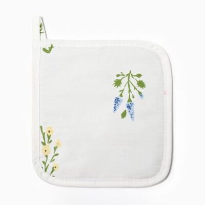 Эти кухонные прихватки с цветочным узором станут верными помощниками на каждой кухне. Квадратная форма и удобная петелька делают их практичными для ежедневного использования, а нежный дизайн добавляет уюта в процесс готовки.ОсобенностиКомплект из двух квадратных прихваток размером 19×19 см.Выполнены из натуральной хлопковой саржи плотностью 190 г/м².Узор: классический цветочно-растительный принт на белом фоне.Оснащены петелькой для комфортного хранения в зоне доступа.Универсальный всесезонный вариант, идеальный подарок на 8 Марта.Щадящий уход: стирка при 30 °C и глажка до 100 °C без отбеливания.Практичность в деталяхПлотная хлопковая ткань надёжно защищает руки от высокой температуры. Благодаря натуральному составу и гладкой фактуре прихватки приятны на ощупь. Их лаконичный дизайн легко впишется в интерьер, создавая атмосферу тепла и заботы о доме.