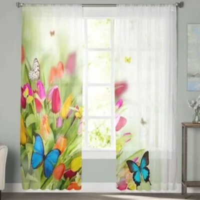 Прозрачные шторы с весенними цветами и бабочками, вуаль для спальни, прозрачные шторы для окон, кухни, тюлевые шторы 135W x 244H(cm)x2
