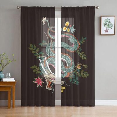 Прозрачные тюлевые занавески в китайском стиле с черным драконом и синим цветом для гостиной, спальни, современные вуали из органзы, шторы W135 x H115cm x1Grommet Top