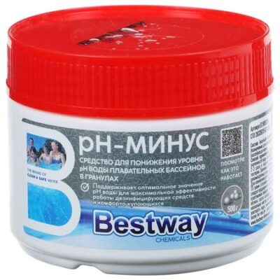 Средство предназначено для понижения уровня рН воды в плавательных бассейнах до нормы.Состав: бисульфат натрия, сульфат натрия.Способ примененияДля поддержания оптимально значения рН воды бассейна в пределах 7,2–7,6 необходимо 2–3 раза в неделю проводить контрольные замеры тестером. Значение рН выше нормы должно быть снижено до рекомендуемых норм добавлением регулятора «рН–минус». Для понижения рН на 0,2 необходимо в 1 м³ воды добавить 15 г средства. Регулятор следует предварительно растворить в 1 л воды в отдельной пластиковой ёмкости, после чего влить раствор порциями вблизи сопла возврата отфильтрованной воды или в нескольких местах, но только не перед фильтрами.