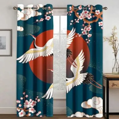 Ретро японский стиль китайский журавль волна гора солнце принт плотная штора спальня гостиная отель окно штора 2 панели новый W55 X H120cm X 2Grommet Top