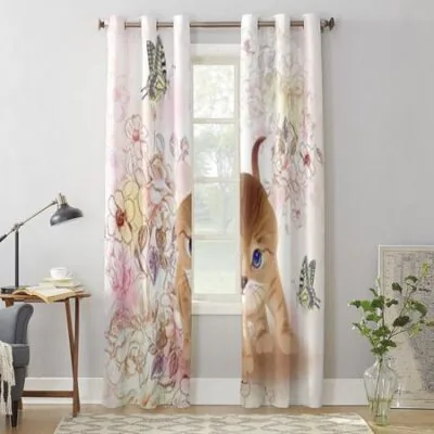 Роскошные оконные занавески с котенком, цветами и бабочками для гостиной, спальни, домашнего декора, кухни, оконные шторы 135W x 60H(cm) x1