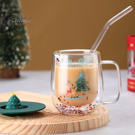 Рождественская стеклянная кофейная кружка с крышкой 250 мл, двухстенная изолированная кружка для питья, прочная стеклянная кружка для напитков, рождественские украшения для дома и офиса красный