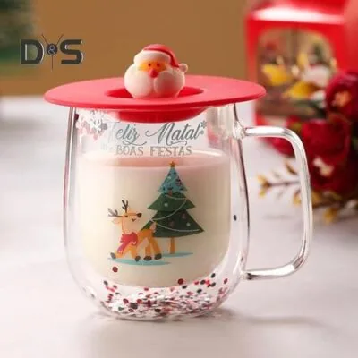 Рождественская стеклянная кофейная кружка с крышкой 250 мл, двухстенная изолированная кружка для питья, прочная стеклянная кружка для напитков, рождественские украшения для дома и офиса красный
