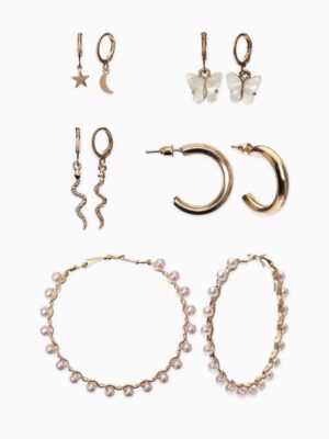 Набор из пяти пар золотистых серег с белыми вставками — универсальный выбор для женщин, ценящих разнообразие и стиль. Длина 5,5 см подчёркивает элегантность и подходит для разных образов и событий.ОсобенностиМеталлическая основа с золотым покрытием обеспечивает прочность и изысканный блеск.Застёжки левербек и пусет надёжно фиксируют серьги, создавая комфорт при носке.Вставки из пластика и полистоуна добавляют текстуру и нежные оттенки белого цвета.Тематика украшений включает бабочек, змей и космические мотивы, придавая образу оригинальность.Разнообразие дизайнов позволяет подобрать серьги под настроение и стиль.Стиль и универсальностьЭтот комплект помогает выразить индивидуальность с помощью сочетания золотистых оттенков и белых деталей. Украшения легко сочетаются с разной одеждой и создают лёгкий акцент, подходящий как для повседневных, так и для праздничных образов.